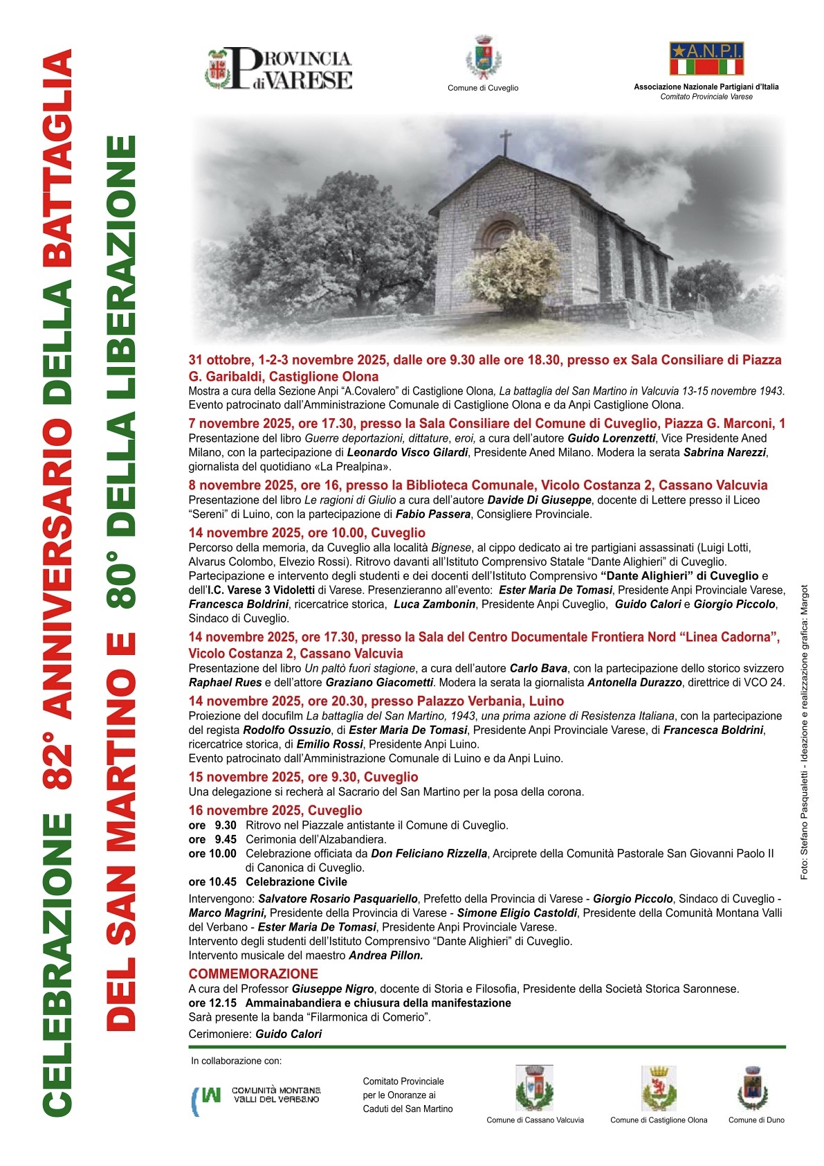Si rinnova anche quest’anno il calendario di eventi dedicati alla Battaglia del San Martino, giunta all’82° anniversario, e all’80° della Liberazione, organizzato dal Comitato Provinciale per le Onoranze ai Caduti del San Martino, promosso dalla Provincia di Varese, dal Comune di Cuveglio e dall’Anpi Provinciale di Varese, in collaborazione con la Comunità Montana Valli del Verbano e i Comuni di Cuvio, Cassano Valcuvia, Castiglione Olona e Duno.