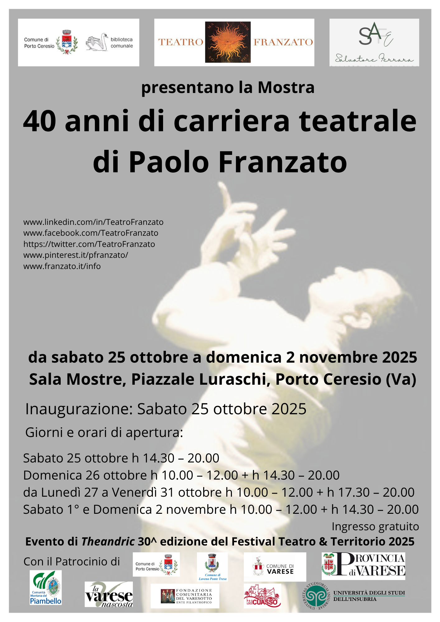 Il Comune di Porto Ceresio, in collaborazione con il Teatro Franzato e con il sostegno di numerosi enti e istituzioni del territorio, presenta la mostra dedicata ai 40 anni di carriera teatrale di Paolo Franzato, in programma da sabato 25 ottobre a domenica 2 novembre 2025 presso la Sala Mostre della Palazzina della Cultura (Piazzale Luraschi, Porto Ceresio – VA).