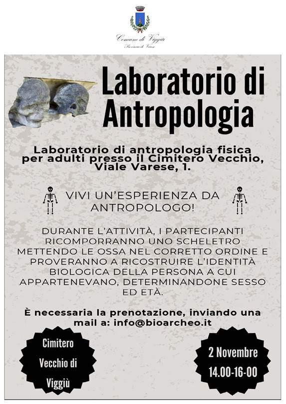2 Novembre: festività dei defunti, sarà possibile effettuare visita guidata al Cimitero vecchio e partecipare al Laboratorio di Antropologia fisica. Prenotazioni info@bioarcheo.it