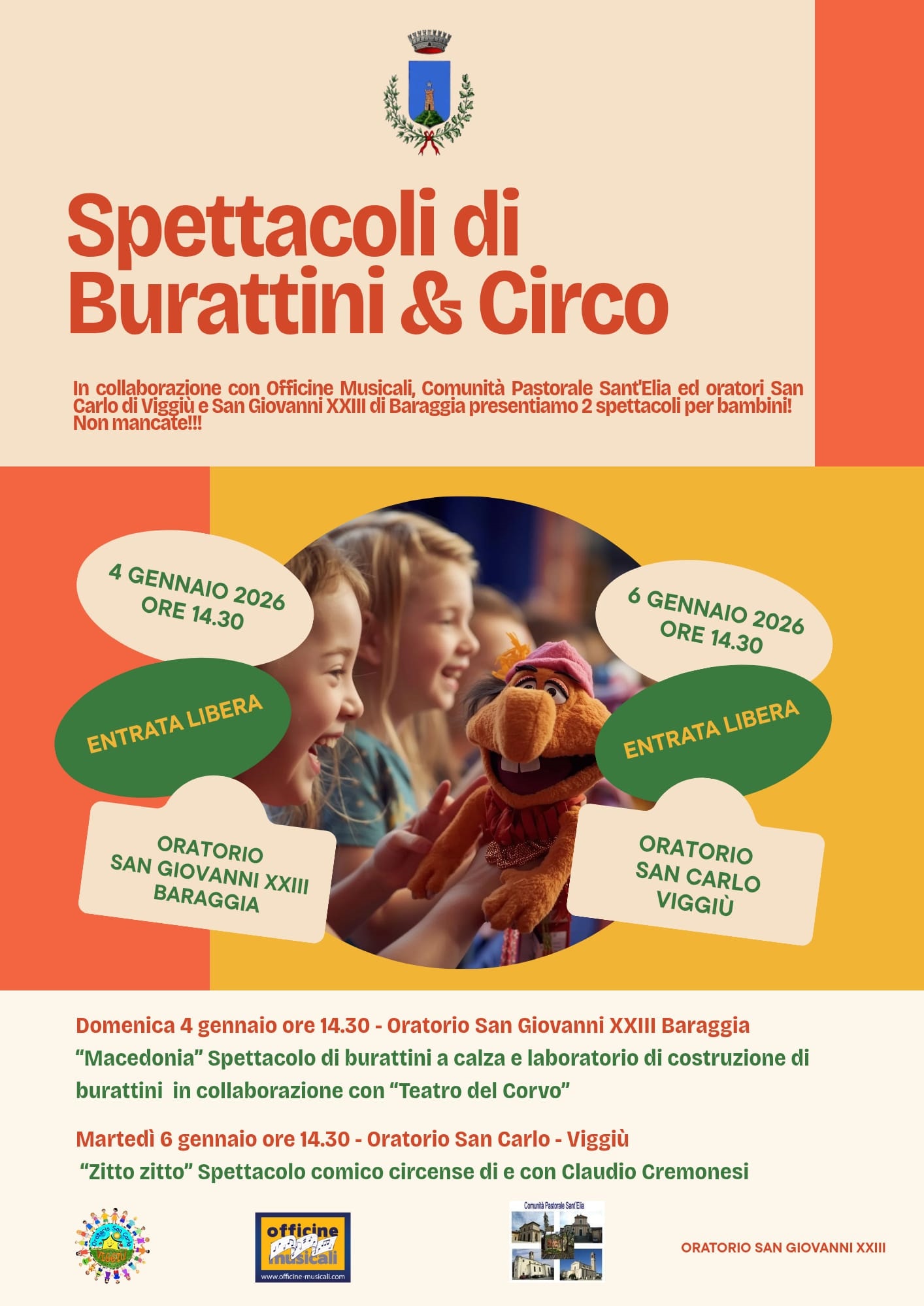 In allegato la locandina degli eventi che si terranno il 4 gennaio 2026 all'oratorio di Baraggia e il 6 gennaio 2026 all'oratorio di Viggiù